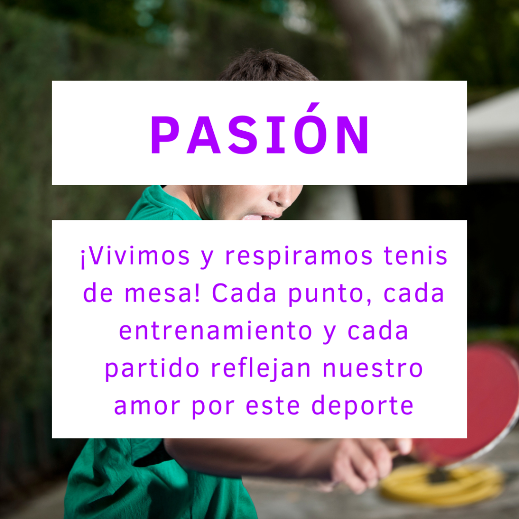 Fomentar el tenis de mesa como un deporte accesible, formativo y competitivo, ofreciendo entrenamientos de calidad en un entorno que motive a la mejora continua y al disfrute del juego. A través de nuestras sedes en España, promovemos el bienestar, el compañerismo y la multiculturalidad, creando una comunidad unida por el juego limpio y el respeto.